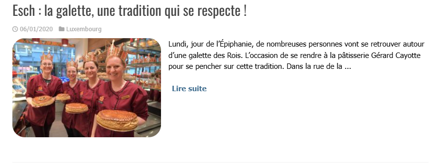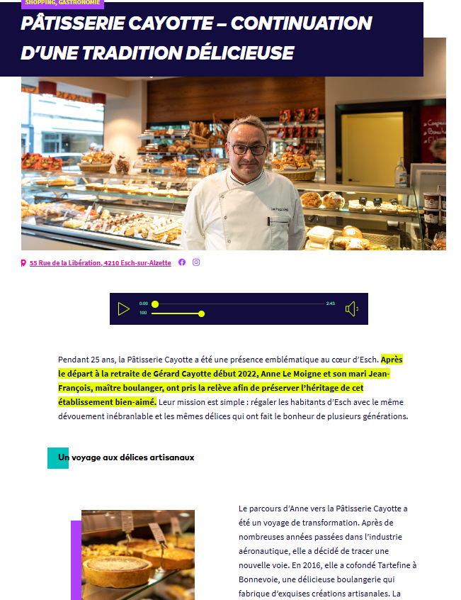 Cayotte dans la presse "Cayotte repris par Anne Le Moigne et son Jean-François, continuation d'une tradition délicisieuse." Notre pâtissier a eu l’honneur de réaliser le Cœur de Joie devant Xavier Bettel. "L'importance de célébrer l'épiphanie chez Cayotte"
