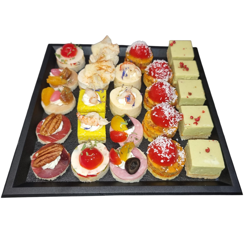 Cake en chorizo, dôme de poivron doux • Savarin de potiron, crème de curry • Biscuit aux pignons grillés, pétale de viande de grison et pickles de légumes • Tonneau de polenta, légumes de Provence • Risotto safrané, bouquet de crevettes • Opéra d’avocat et citron • Œillet de tête de moine • Rosace de jambon à l’abricot et figue • Tomate mozzarella • Jambon œuf de caille, asperge • Mirliton d’écrevisse, orange confite et sablé breton • Chiffonnade de saumon fumé, crème citronnée et oignons confits.